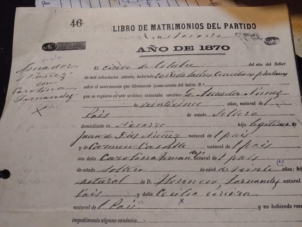 Estas mujeres negras criaban a una niña blanca, Víctor la veía cada vez que venía, o cuando ellas iban de paseo al campo. (Voy a ir dejando los detalles y dando los trancos más largos, sino me extenderé demasiado). Con el tiempo, esta niña se hizo señorita y se enamoraron. En el año 1870 se casaron en Lobos y paso a ser mi bisabuela, se llamaba Carolina Fernández. Los primero hijos nacen allá, pero cuando los patrones compran estos campos, ellos emprenden el éxodo y desde entonces nos quedamos para siempre. Aquí desde 1884 nacen el resto de los hijos, hasta completar la docena,una de ellas mi abuela Enriqueta en 1888. Al poco tiempo, Víctor ayudara a sus patrones y al agrimensor oficial, a tirar los primeros piolines para delimitar la plaza de San Jorge.