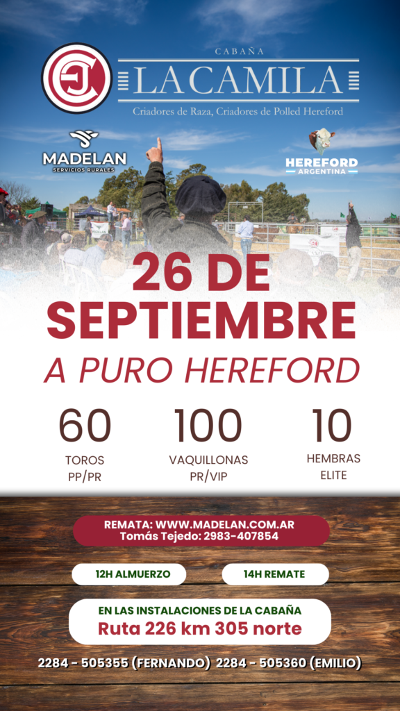 El calendario ganadero bonaerense tiene una cita marcada en rojo: el remate anual de Cabaña La Camila. Lo que comenzó hace apenas cinco años como un desafío familiar, hoy se consolidó como un encuentro esperado por criadores, clientes y amigos, que reconocen en la genética Hereford de la familia Castillo una garantía de calidad y confianza.