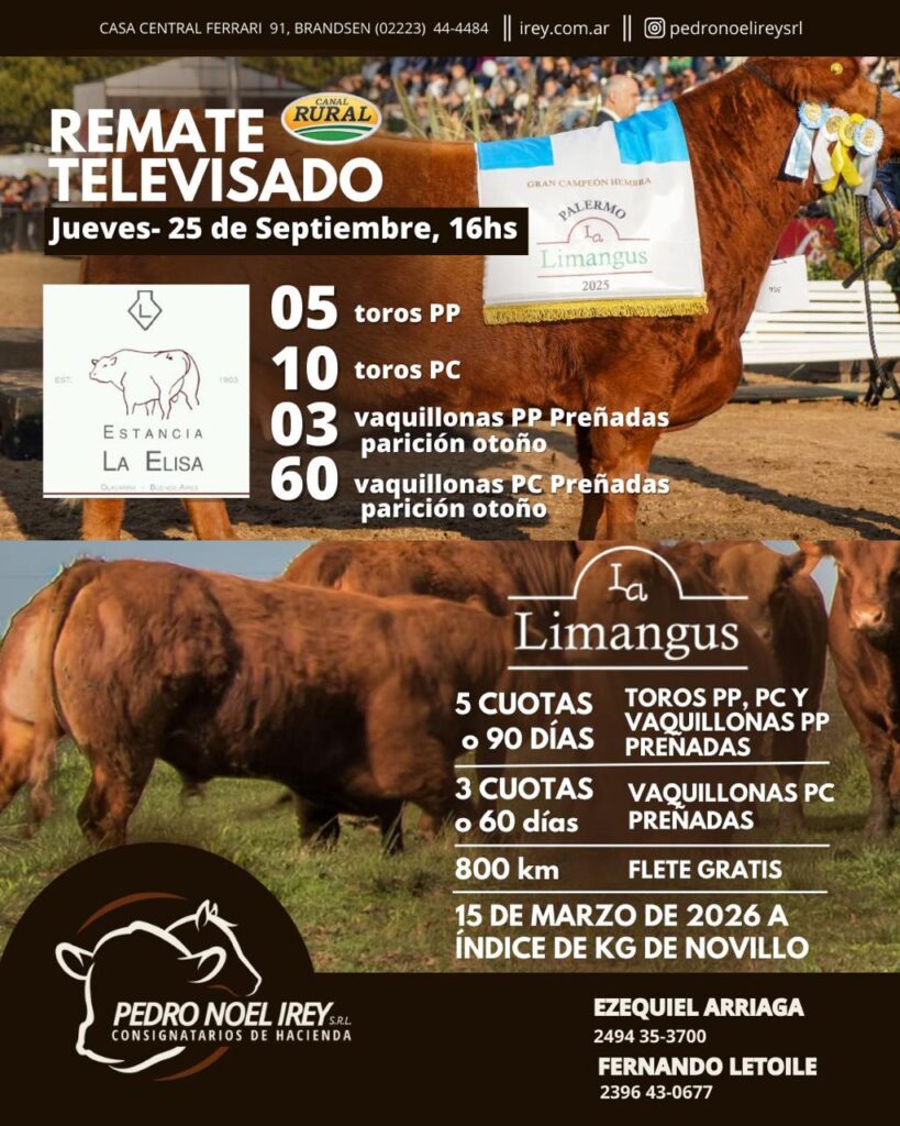 La cabaña Limangus de Olavarría, que este año se coronó en Palermo y en la Expo de Otoño de la raza, anuncia su 3° Remate Anual de Limangus el jueves 25 de septiembre a las 16 hs, con transmisión por Canal Rural y el martillo de Pedro Noel Irey. Una subasta 100% virtual que ofrecerá genética de excelencia y condiciones comerciales competitivas.