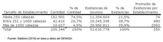 El veterinario se pregunta en el artículo qué sucede con las existencias de esos establecimientos en porcentajes: las mismas son de 21,5%, 38,7% y 39,9% respectivamente, concluyendo que está claro que el mediano y pequeño productor debe integrarse y es de suma «urgencia» que comiencen a ser eficientes si deciden continuar prevaleciendo en el negocio de la ganadería a futuro.