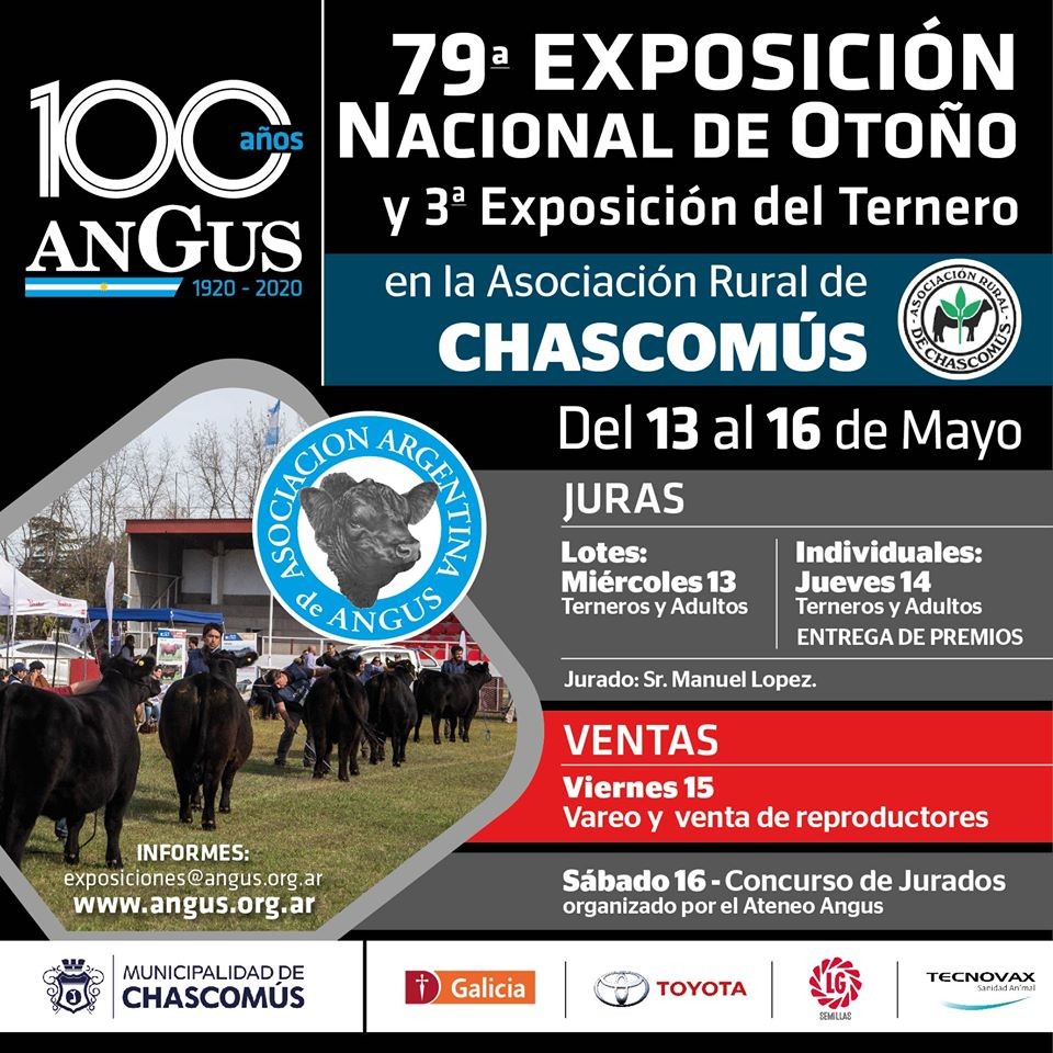 Con motivo de celebrarse el centenario de la Asociación Argentina de Angus se desarrollará la 79° Exposición Nacional de otoño y la 3° Exposición del Ternero conjuntamente con la Exposición de caballos A Puro Criollo, que tendrá lugar entre el 13 y el 17 de mayo.