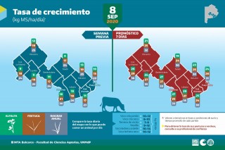 En el marco del ciclo que impulsa la EEA INTA Balcarce en conjunto con la Facultad de Ciencias Agrarias de la Universidad de Mar del Plata, se publicaron dos nuevas infografías sobre la tasa de crecimiento promedio estimado de alfalfa, festuca y raigrás anual para las semanas previas al 1ro. y al 8 de septiembre, respectivamente, incluyendo en ambos casos una estimación para la siguiente.
