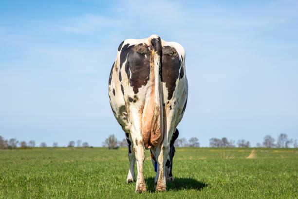 Grazing cow from behind, stroll towards the horizon, empty udder, in a meadow under a blue sky with clouds.