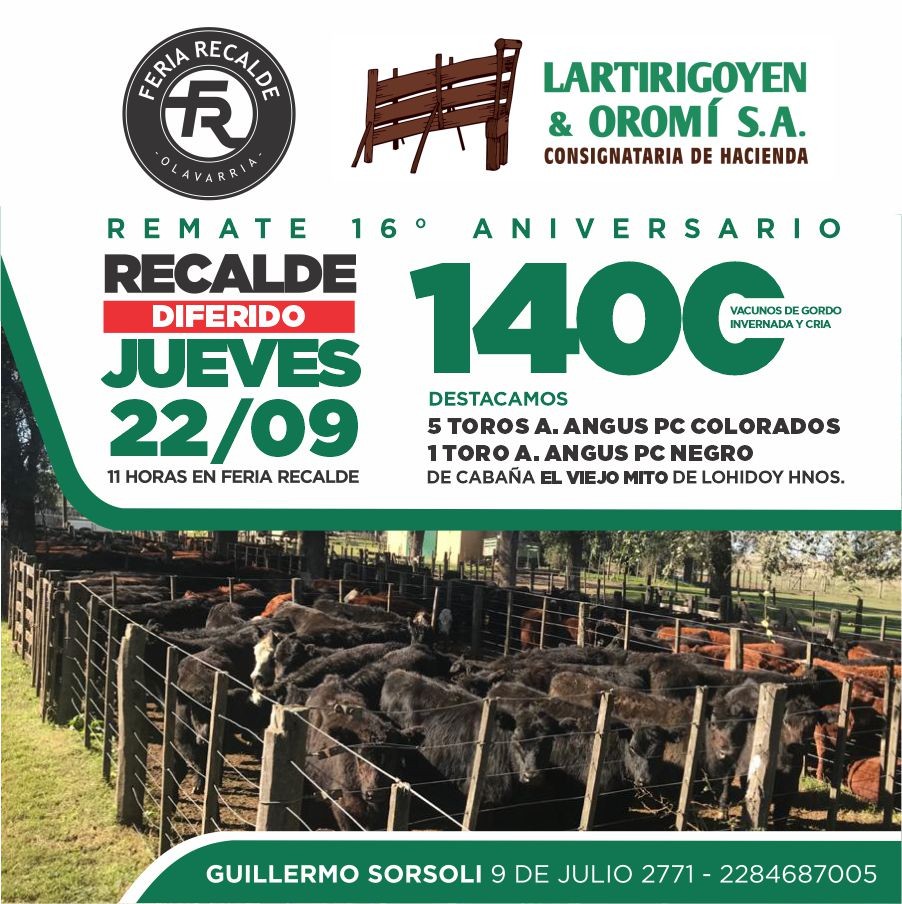 El remate 16° Aniversario de la firma en Recalde, que estaba programado para este miércoles, fue diferido para el jueves debido a las lluvias caídas en la zona. Se anuncian 1400 vacunos de gordo, invernada y cría y toros Angus PC