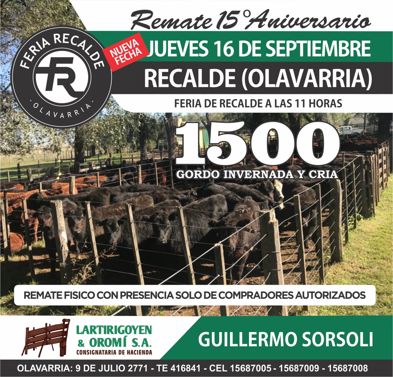 Se llevara a cabo desde las 11 hs. en las instalaciones con que cuenta la firma en la localidad de Recalde, Partido de Olavarría con haciendas generales de Gordo Invernada y cría. Para más información contactarse con Guillermo Sorsoli en sus oficinas de 9 de Julio 2771 ó a los teléfonos 02284 416841, 02284 15687005 / 7008 / 7009