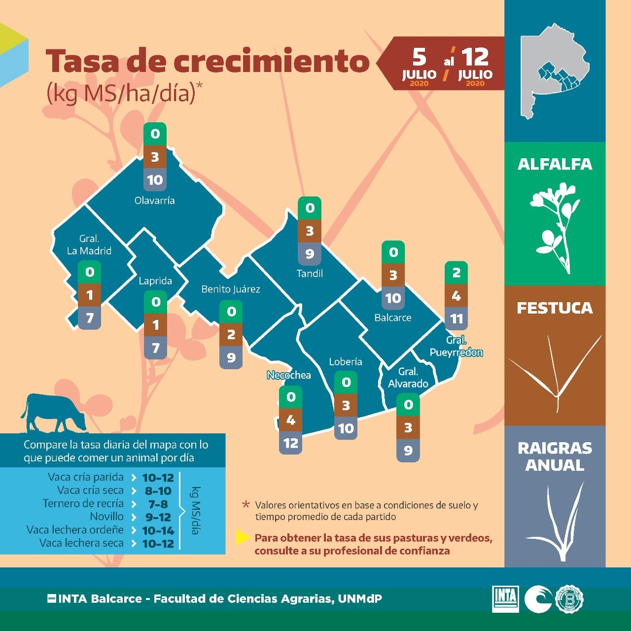 INTA Balcarce y la UNMdP presentaron una nueva infografía sobre la tasa de crecimiento de tres especies forrajeras en 10 partidos, en base a modelos informáticos.