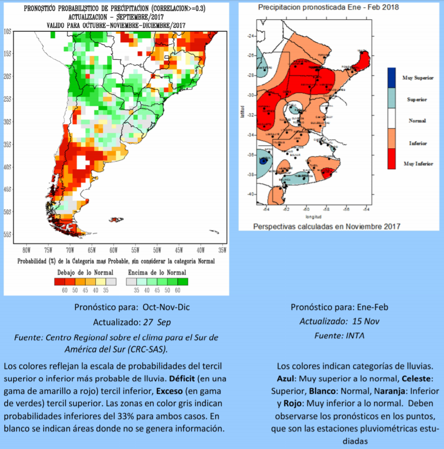 Para el trimestre NOV-DIC-ENE el Servicio Meteorológico estima como más probable un escenario de precipitaciones menores a lo normal sobre gran parte de las zonas de producción con una probabilidad del orden de 40%; la excepción es el este de Buenos Aires donde las probabilidades son mayores para las precipitaciones normales.