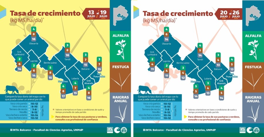 El área de influencia del trabajo abarca 10 partidos en total, incluyendo Olavarría, General Lamadrid, Laprida, Benito Juárez, Tandil, Necochea, Lobería, Balcarce, General Alvarado y General Pueyrredón, y las estimaciones son semanales, basadas en modelos informáticos referidos a crecimiento de alfalfa, festuca y raigrás anual, expresado en kilogramos de materia seca por hectárea y por día. En el mismo informe se agrega una tasa estimada de requerimientos por categoría.