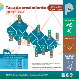 En el marco del ciclo que impulsa la EEA INTA Balcarce en conjunto con la Facultad de Ciencias Agrarias de la Universidad de Mar del Plata, se publicaron dos nuevas infografías sobre la tasa de crecimiento promedio estimado de tres especies forrajeras, durante el período que va del 13 al 26 de julio de 2020.