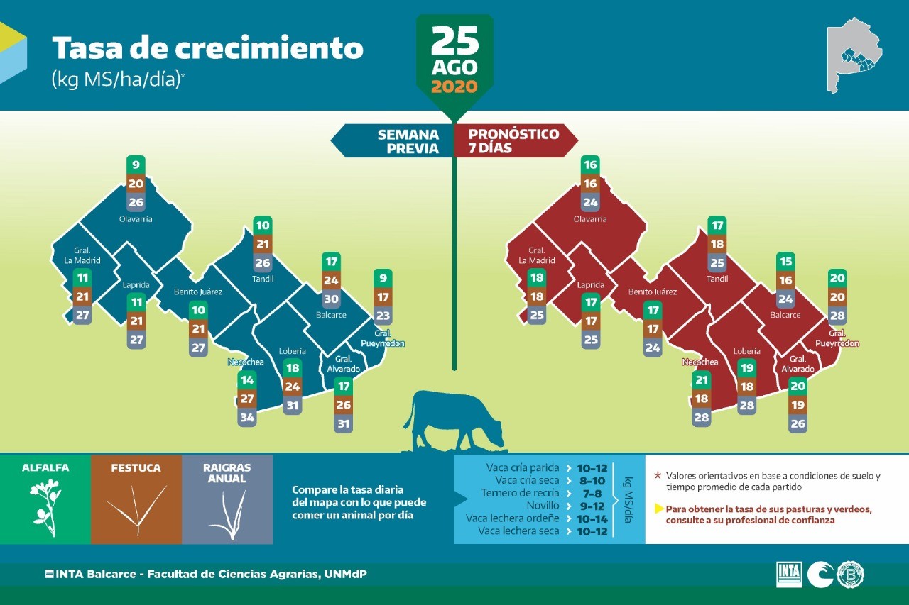 En el marco del ciclo que impulsa la EEA INTA Balcarce en conjunto con la Facultad de Ciencias Agrarias de la Universidad de Mar del Plata, se publicó una nueva infografía sobre la tasa de crecimiento promedio estimado de alfalfa, festuca y raigrás anual durante el período que va del 18 al 25 de agosto de 2020, en base a modelos informáticos.