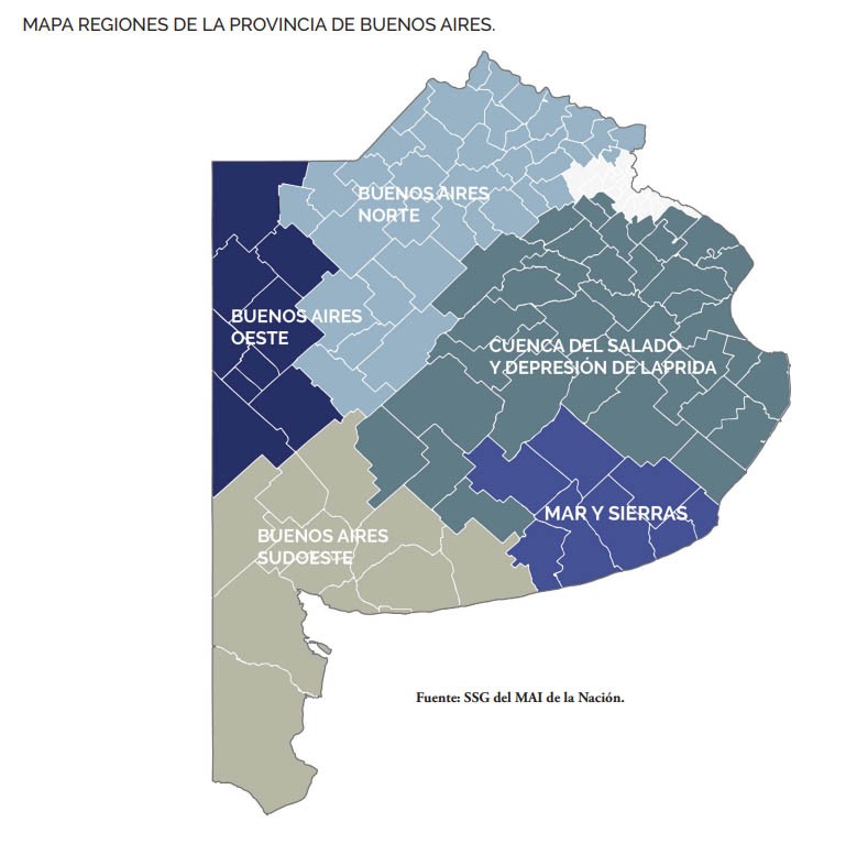 La división de la Provincia, a excepción del conurbano bonaerense, se realiza en función de la caracterización agrícola ganadera, sustentada en el uso del suelo para ganadería y agricultura según el siguiente mapa, entendiendo que desde esta visión se facilita el análisis de este extenso territorio.