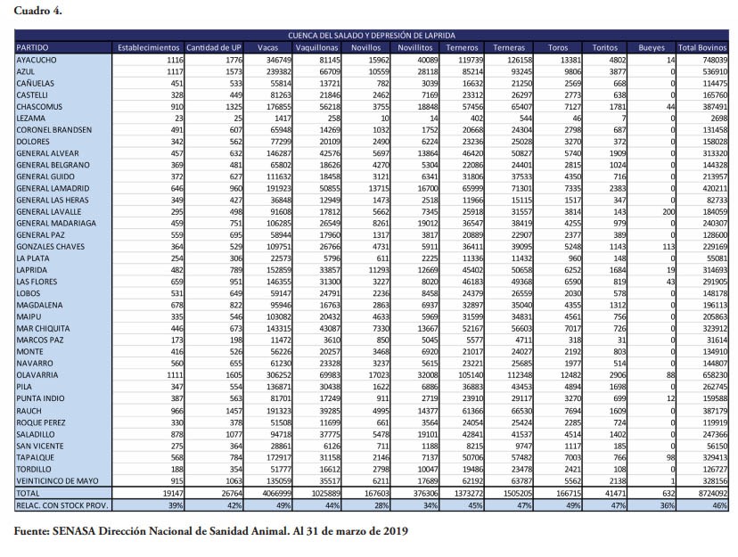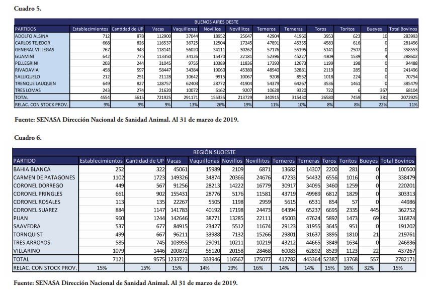 El trabajo fue desarrollado en base a información suministrada al 31 de marzo de este año por el SENASA, e indica además que este stock vacuno se encuentra en 48.909 explotaciones ganaderas con 63.672 Unidades Productivas, lo que representa el 24% y 19,7% del total del país respectivamente. (Ver cuadros 1 y 2)