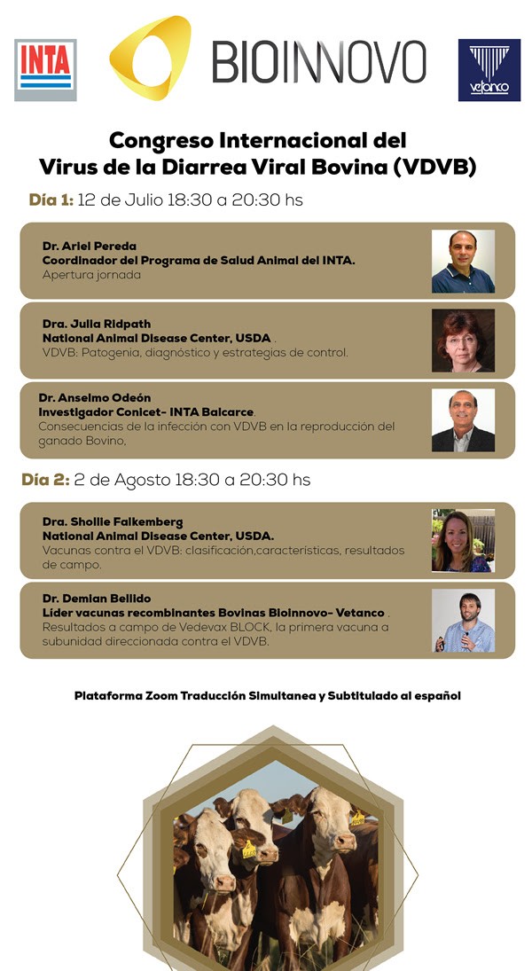 Bioinnovo, la empresa público-privada formada por Vetanco y el INTA, organiza el Primer Congreso Internacional del Virus de la Diarrea Viral Bovina (VDVB), que dio comenzo el lunes 12 de julio, y que tendrá una segunda jornada el lunes 2 de agosto, por una plataforma online.