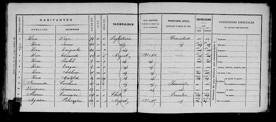 Otro hallazgo. Una planilla del Censo de 1869 donde puede verse que en esa época se registraban los habitantes con nombre y apellido. Con Jorge Keen padre a la cabeza figuran varios de sus hijos (quienes luego fundaron las colonias y las estancias de la zona). Si miramos con ternura, ahí está en el Censo junto con ellos mi bisabuela, Carolina Fernández (sirvienta dice el texto), quien al año siguiente se casaría con Victor Nuñez, los protagonistas del relato anterior (La Cautiva de San Jorge)
