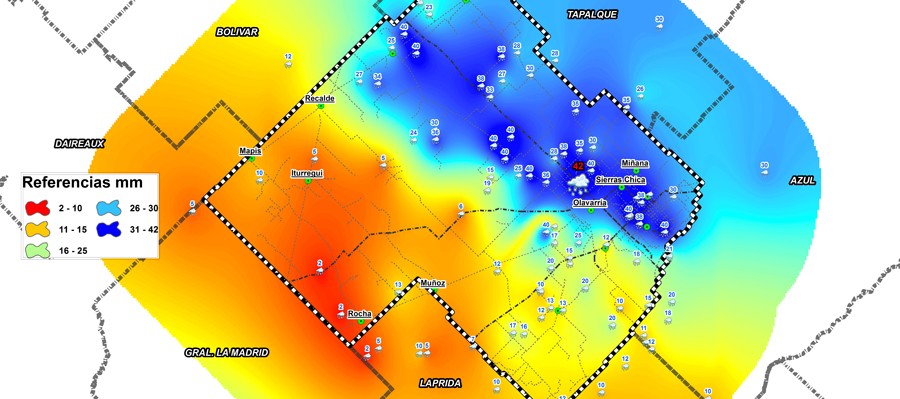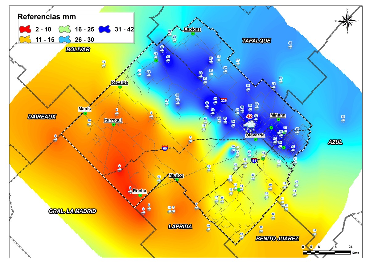 Mapa elaborado por la Dirección Agropecuaria perteneciente a la Secretaría de Desarrollo Económico de la Municipalidad de Olavarría en base a los datos brindados por la comunidad de usuarios de los grupos de lluvias de ZonaCampo. En este mapa se pueden observar los sectores de mayor y menor precipitación mediante colores que caracterizan zonas de comportamientos de PP homogéneos.