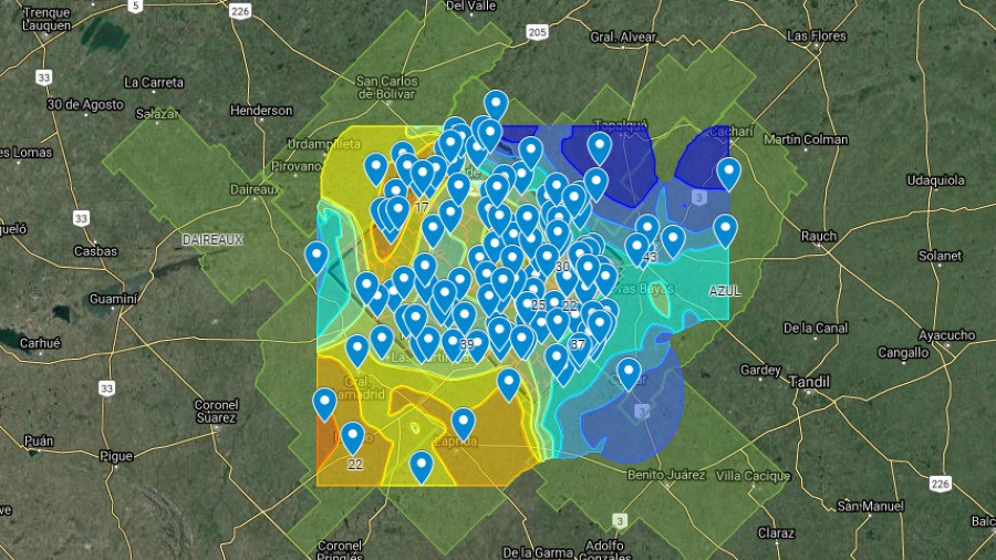 El promedio de lluvias caídas entre los 136 puntos rondó los 31mm. Los valores máximos en el Partido de Olavarría se dieron en la zona de Espigas, con registros que alcanzaron los 68mm. En Parish (Azul) se reportaron 56mm.