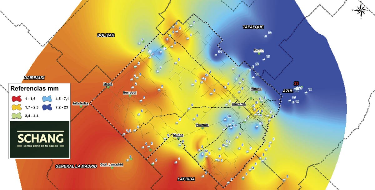 Gracias al trabajo del Lic. en Geografía Martín Orradre, de la empresa Tecnología Satelital para el Agro y al auspicio de Schang Agroveterinaria presentamos el mapa de interpolación de precipitaciones donde en forma on line se pueden apreciar los sectores de mayor y menor precipitación mediante colores que caracterizan zonas de comportamientos de PP homogéneos con el detalle de los valores de lluvias caídas y el lugar donde se tomó cada uno.