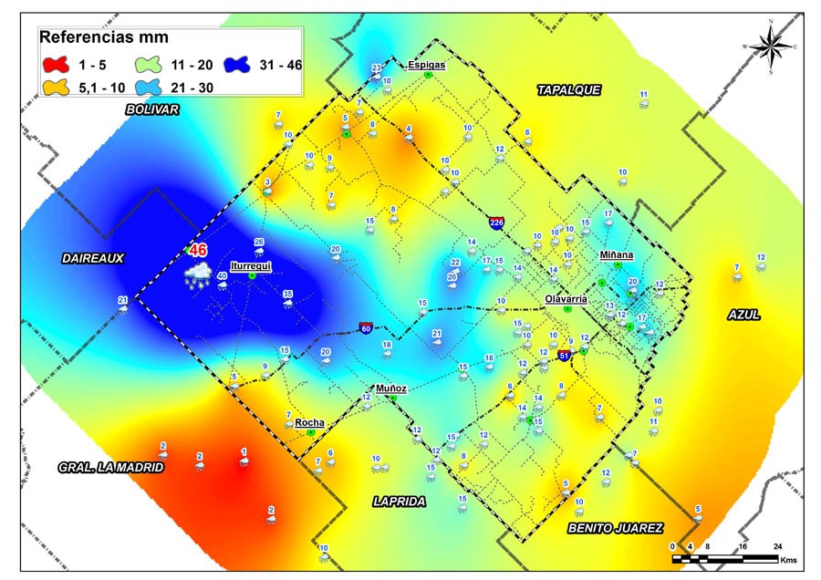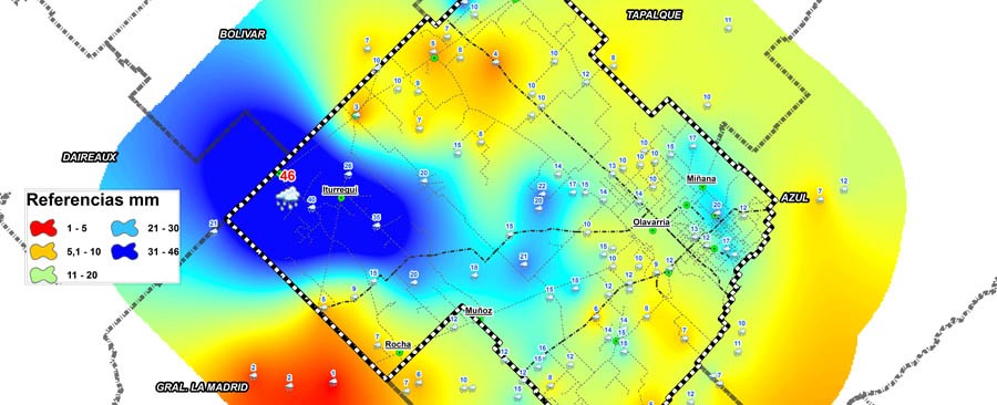 Mapa elaborado por la Dirección Agropecuaria perteneciente a la Secretaría de Desarrollo Económico de la Municipalidad de Olavarría en base a los datos brindados por la comunidad de usuarios de los grupos de lluvias de ZonaCampo. En este mapa se pueden observar los sectores de mayor y menor precipitación mediante colores que caracterizan zonas de comportamientos de PP homogéneos.