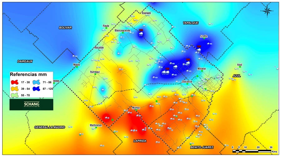 La lluvia caída duplicó todos los pronósticos y trajo alivio a la zona promediando los 65 mm. caídos entre los 149 registros aportados por la comunidad ZonaCampo. Los valores máximos en el Partido de Olavarría se dieron en Blanca Chica, Blanca Grande y Paraje el Gaucho llegando a los 120 mm.