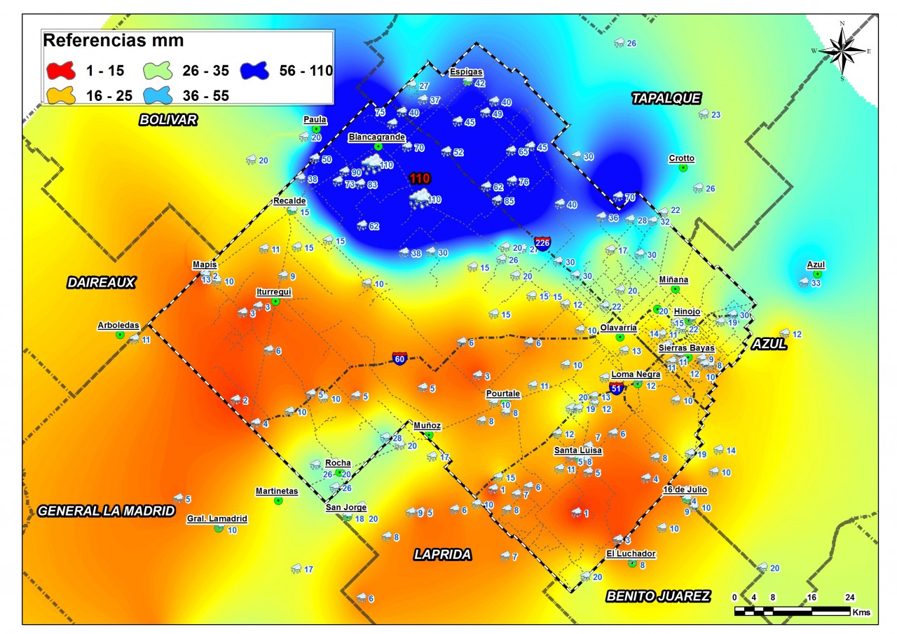 Con la colaboración de productores de la zona que aportan los datos de sus localidades o establecimientos, elaboramos un mapa interactivo y el mapa de interpolación de precipitaciones en el que se pueden observar los sectores de mayor y menor precipitación mediante colores que caracterizan zonas de comportamientos de PP homogéneos. En ambos mapas se puede observar en detalle los valores de lluvias caídas y el lugar donde se tomó cada uno. En lo que fue la quinta lluvia del mes, los registros máximos se dieron en el noroeste del partido, en los límites con los partidos de Bolívar y Tapalqué. En la zona de Blanca Grande se ubicó el registro máximo con 110 mm., aunque el mapa muestra claramente que las lluvias más importantes se dieron sólo en esa zona del partido y el promedio entre los 166 puntos registrados marcó 22,12 mm..