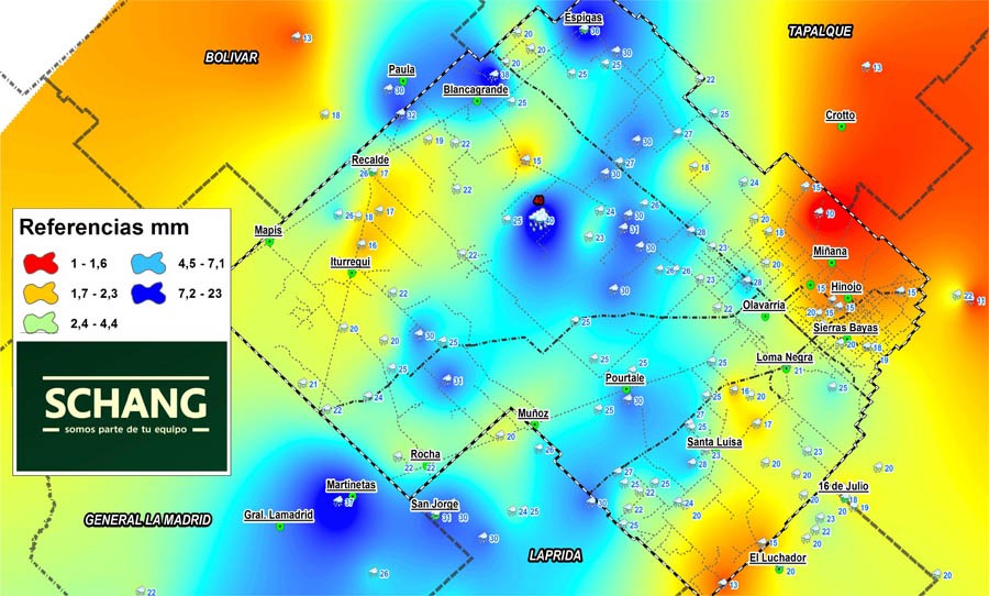 Gracias al trabajo del Lic. en Geografía Martín Orradre, de la empresa Tecnología Satelital para el Agro y al auspicio de Schang Agroveterinaria presentamos el mapa de interpolación de precipitaciones donde en forma on line se pueden apreciar los sectores de mayor y menor precipitación mediante colores que caracterizan zonas de comportamientos de PP homogéneos con el detalle de los valores de lluvias caídas y el lugar donde se tomó cada uno.