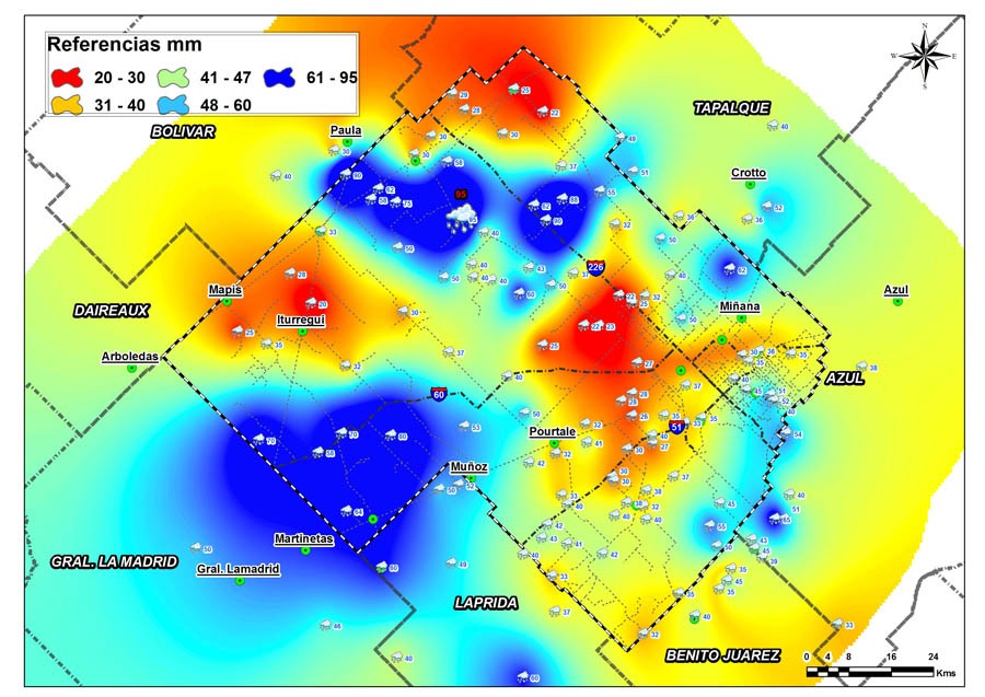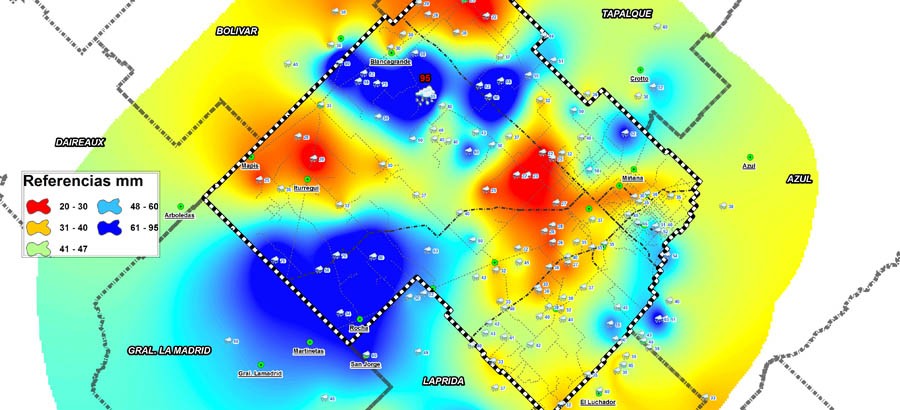 Mapa elaborado por la Dirección Agropecuaria perteneciente a la Secretaría de Desarrollo Económico de la Municipalidad de Olavarría en base a los datos brindados por la comunidad de usuarios de los grupos de lluvias de ZonaCampo. En este mapa se pueden observar los sectores de mayor y menor precipitación mediante colores que caracterizan zonas de comportamientos de PP homogéneos.