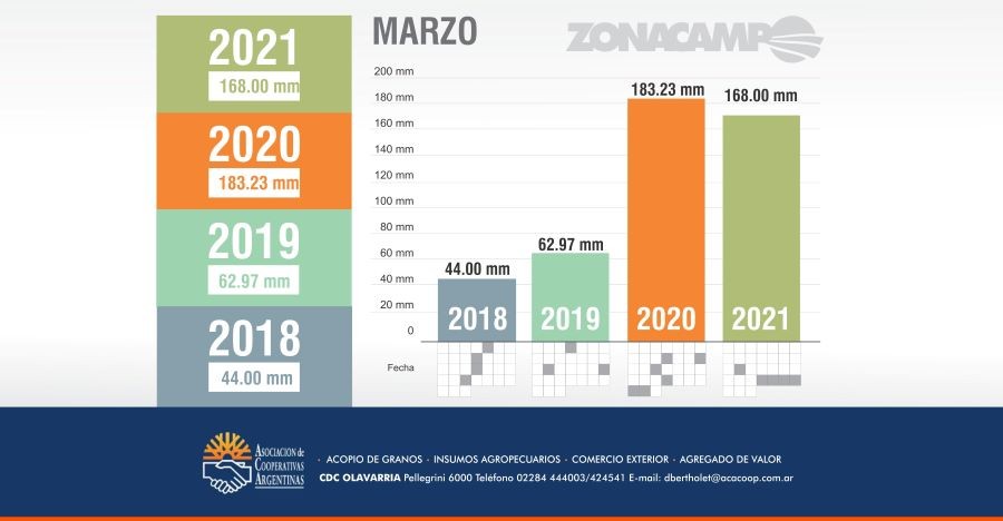 El año pasado tuvimos bastante agua en marzo… cayeron 183mm promedio, y nos cayó el «baldazo» de la pandemia. Afortunadamente, el campo pudo seguir trabajando y las lluvias vinieron más que bien. Este año tuvimos un poco menos de lluvia, aunque estuvimos cerca (168mm) y nuevamente un «baldazo», esperemos que todo salga bien. Si vamos solo a precipitaciones, ambos registros le pasan por encima a los escasos milimetrajes de 2018 y 2019.