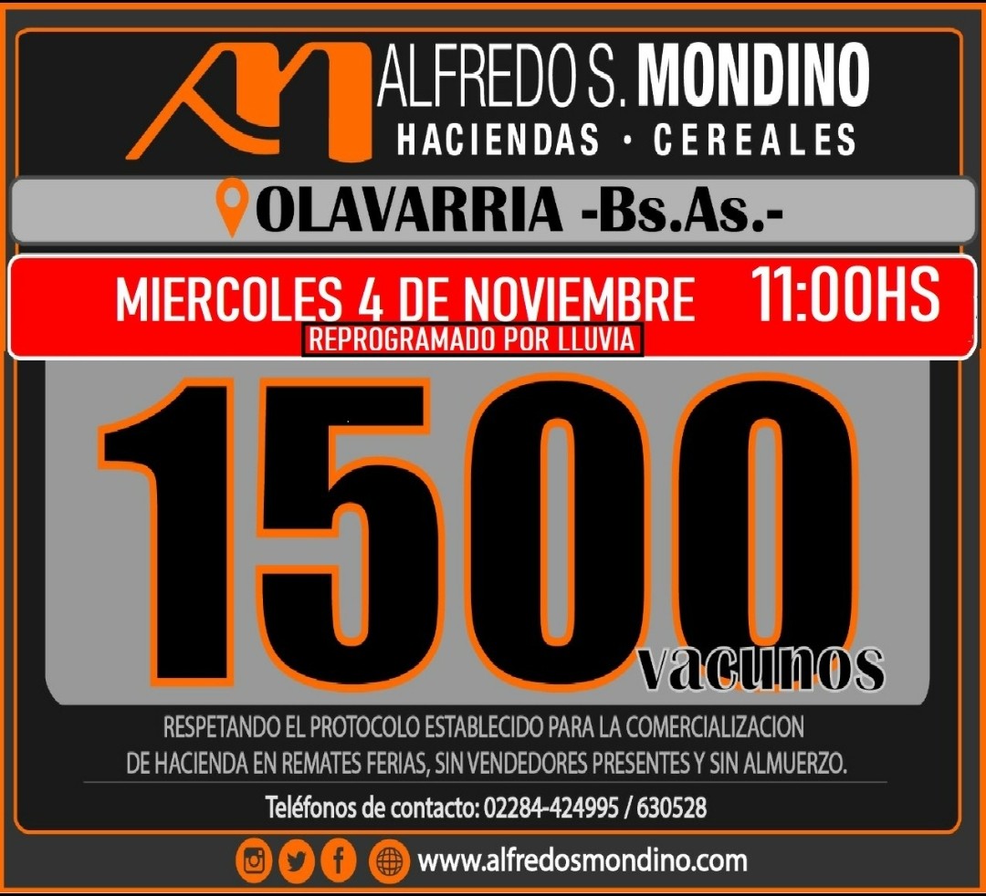 En instalaciones de la Sociedad Rural de Olavarría desde las 11 horas, sólo con la presencia de compradores autorizados, sin almuerzo y siguiendo el protocolo establecido para la comercialización de hacienda en remates feria.