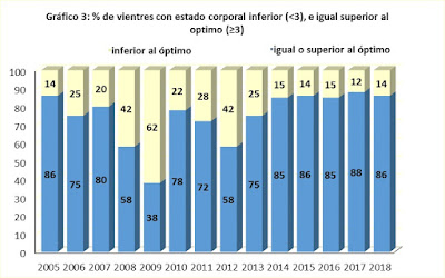 El estado corporal promedio de los vientres al final del servicio fue de 3,3 (gráfico 2) con un 14% de los vientres con estado inferior al óptimo (gráfico 3).