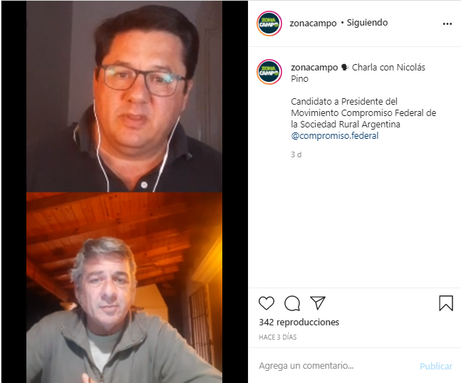 Finalmente, en la charla previa a la entrevista, Pino se refirió a otro tema importante, como es la comunicación. «Creo que desde la entidad no se está haciendo una buena comunicación, y desde nuestro espacio queremos instalar a la SRA en la sociedad toda. Más allá de la Exposición Rural, tenemos que lograr que los directores zonales que tenemos 300 distribuidos en todo el país, se integren en la vida de su comunidad, que participen de las fuerzas vivas de su comunidad, que sea una entidad seductora para el productor joven de cada ciudad y a las mujeres», concluyó cuando ya se nos hacía la hora anunciada ara salir en vivo.