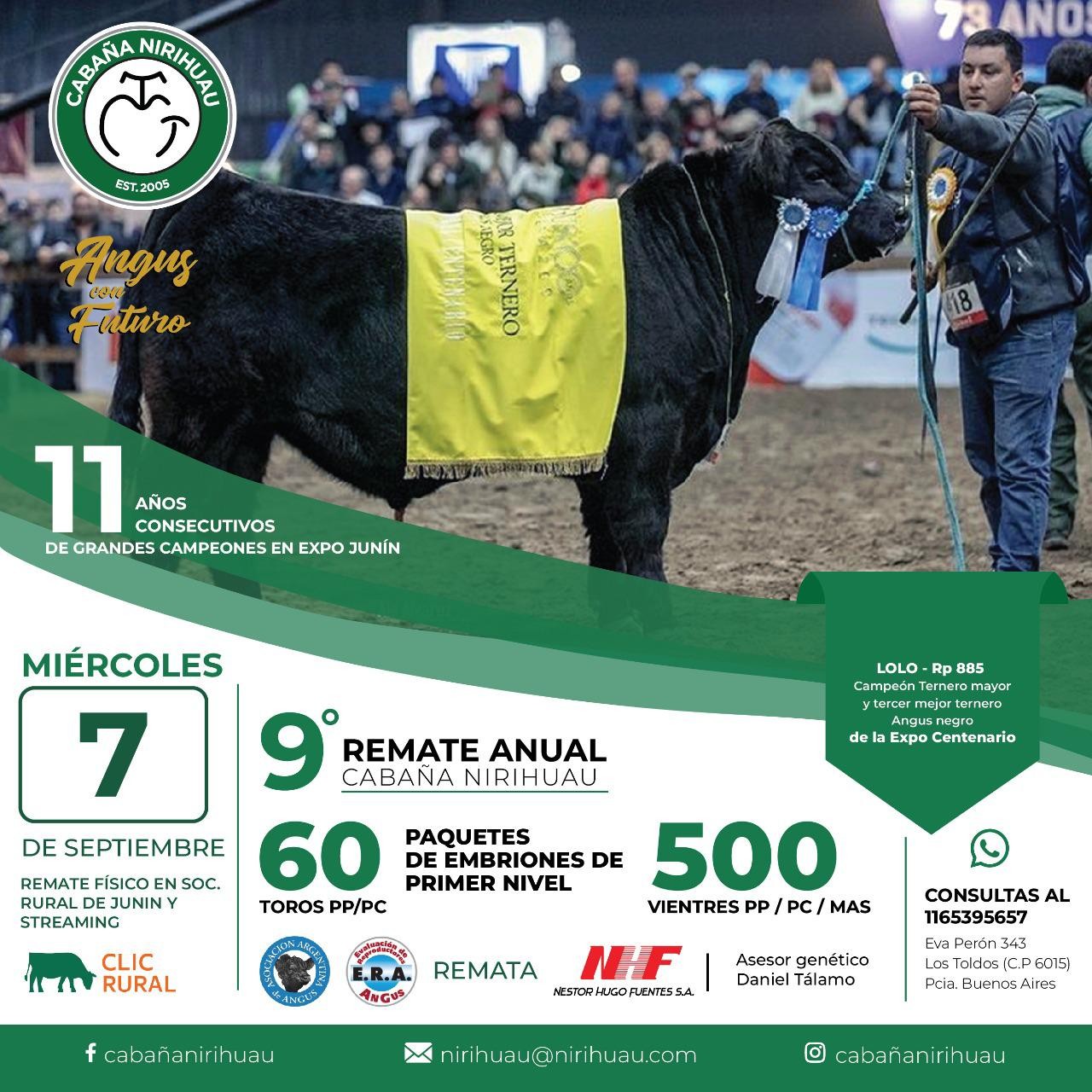 Están en marcha los preparativos para el 9no. remate anual «Angus con Futuro» de Cabaña Nirihuau, que tendrá lugar el miércoles 7 de septiembre de 2022 en la doble modalidad físico en la Sociedad Rural de Junín y vía streaming por la plataforma Clic Rural. Rematará como siempre la firma Néstor Hugo Fuentes.