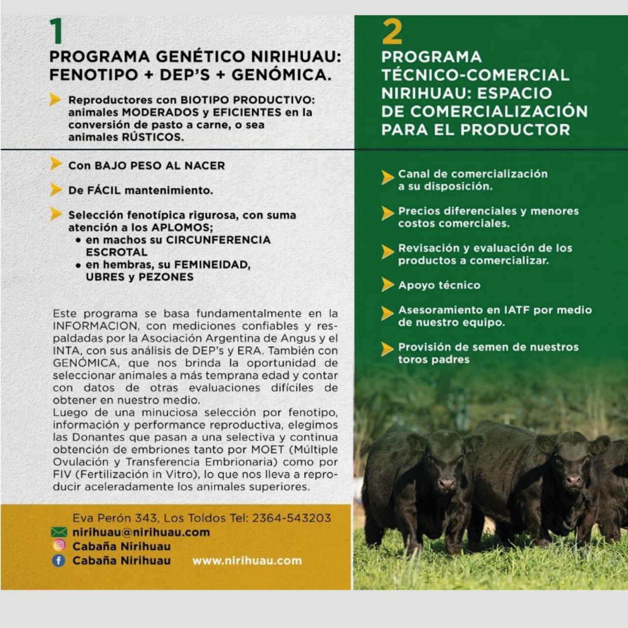 Respecto del programa Técnico Comercial Nirihuau, la cabaña pone a disposición de los productores un canal de comercialización caracterizado por precios diferenciales y menores costos comerciales, y con ventajas que incluyen la revisación y evaluación de los productos a comercializar, apoyo técnico, asesoramiento en IATF por medio del equipo técnico de la cabaña y provisión de semen de sus toros padres.