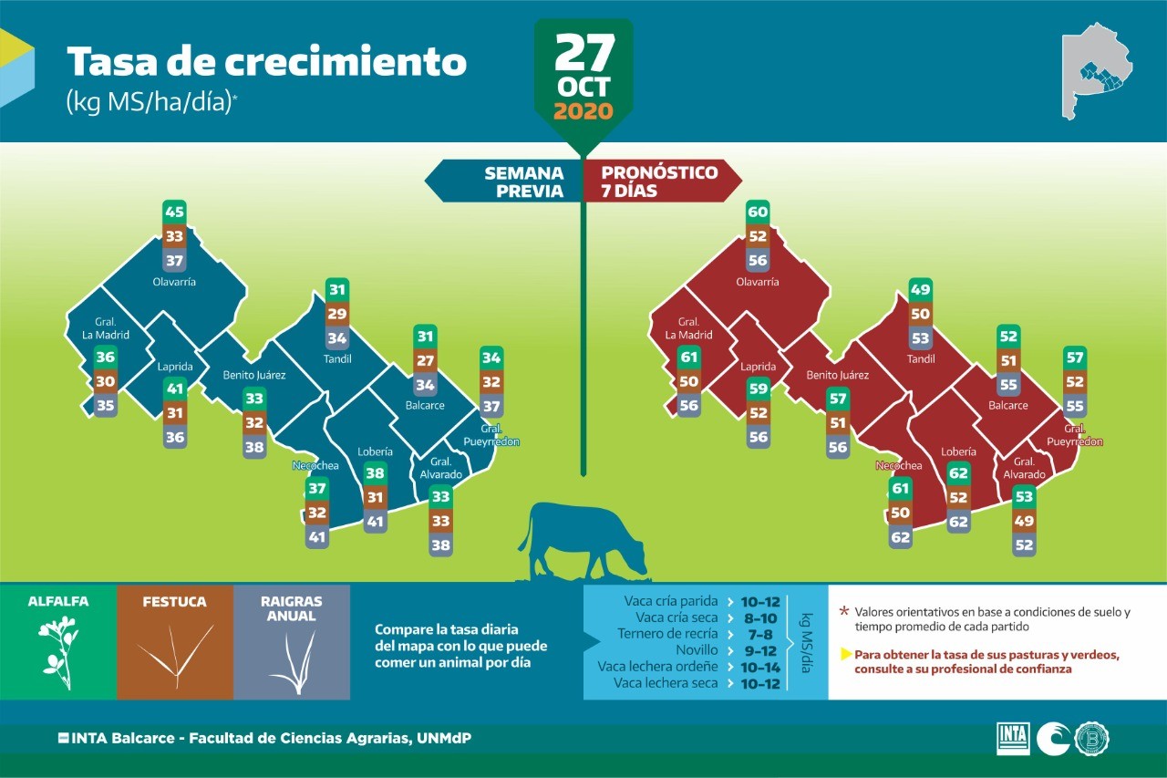 INTA Balcarce y la UNMdP presentaron nuevas infografías sobre la tasa de crecimiento de tres especies forrajeras en 10 partidos, en base a modelos informáticos. Semanas del 20 y 27 de octubre.