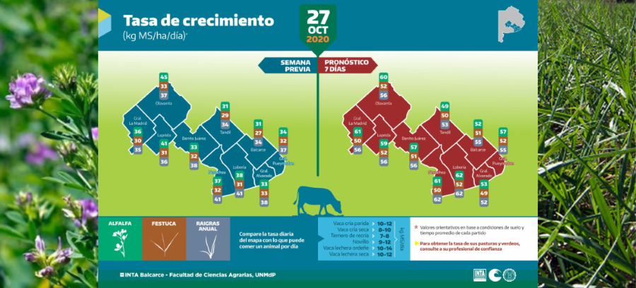 Estas infografías son elaboradas en conjunto por EEA INTA Balcarce y la Facultad de Ciencias Agrarias de la Universidad de Mar del Plata, sobre la tasa de crecimiento promedio estimado de alfalfa, festuca y raigrás anual. La presente edición corresponde a las semanas que concluyeron el 20 y 27 de octubre, y el pronóstico para la semana entrante.