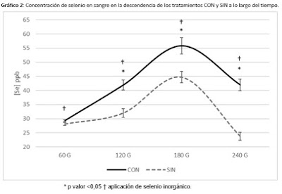 Para determinar la concentración de selenio en sangre el estudio contempló análisis a los 60, 120, 180 y 240 días, mientras que en los terneros a las 48 horas post parto y a los 30, 90, 104 y 140 días de vida.
