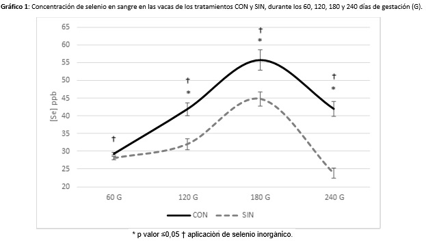Para determinar la concentración de selenio en sangre el estudio contempló análisis a los 60, 120, 180 y 240 días, mientras que en los terneros a las 48 horas post parto y a los 30, 90, 104 y 140 días de vida.