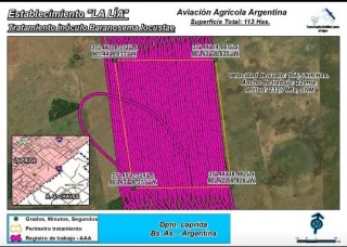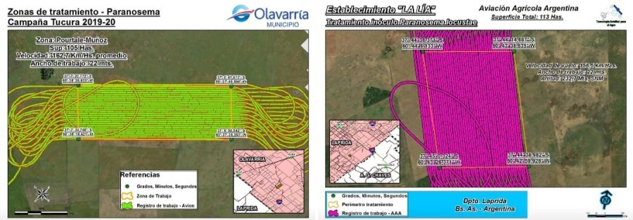 «Nuestros aviones tienen un sistema de seguimiento satelital, por lo cual se pudieron hacer dos mapas donde se nota bien claro el trabajo realizado y las franjas de las aplicaciones, con una cobertura de 22 metros utilizando el equipo con el cual se siembran las pasturas o se fertiliza en forma aérea. Lo más complicado fue calibrar el avión para tirar dos kilogramos por hectárea de la mezcla de salvado de trigo con paranocema locustae», remarcó el aplicador.