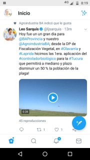 El propio ministro Sarquís destacó la innovación y el trabajo de su equipo. «Estamos poniendo a punto la técnica de formulación, el momento óptimo de la aplicación y los monitoreos, a fin de adquirir la experiencia necesaria para los próximos años donde se aplicará en forma masiva. Los resultados se verán a largo plazo», expresó.indicando en un Twitt que se trataba de «un gran día» para la provincia y su ministerio, ya que el objetivo es llegar a una disminución de la plaga a la mitad de su población actual.