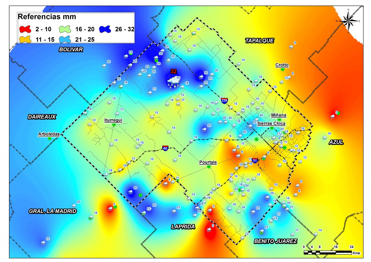 Con la colaboración de productores de la zona que aportan los datos de sus localidades o establecimientos, elaboramos un mapa interactivo con 132 puntos de registro para ver en detalle los valores de lluvias caídas y el lugar donde se tomó cada uno. En esta oportunidad los registros máximos en nuestro partido se dieron en la zona de Blanca Grande.