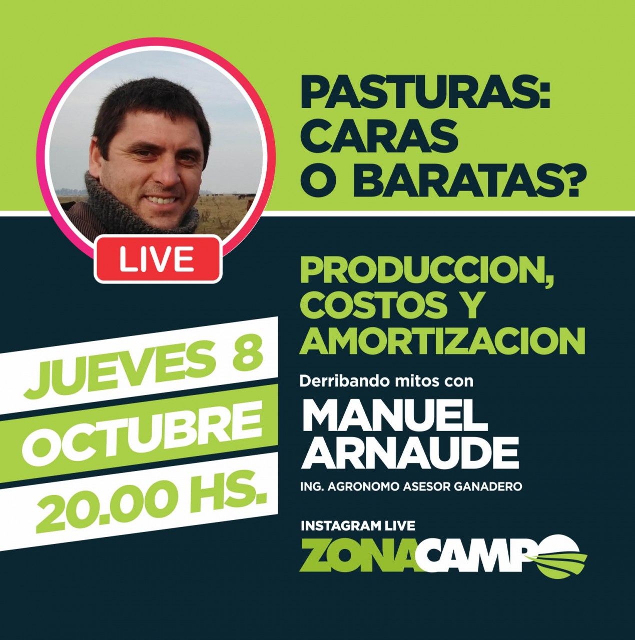 Este Jueves 8 desde las 20 horas a través del Instagram Live de ZonaCampo, Manuel Arnaude se propone derribar todos los mitos sobre producción, costos y amortización de pasturas. Arnaude es Ingeniero Agrónomo, asesor Ganadero con experiencia en Producción y Manejo del pasto y Responsable técnico de la Escuela de Pastores de Gentos S. A.