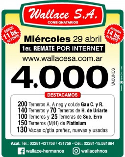 Este es el caso del remate que dará la tradicional casa Wallace Hnos. el miércoles 29 a partir de las 14hs, que se realizará a través de la plataforma virtual de la casa, ingresando a www.wallacesa.com.ar , y para el cual se «encerraron» unas 4000 cabezas entre las diferentes categorías, incluyendo gordo, invernada y cría.
