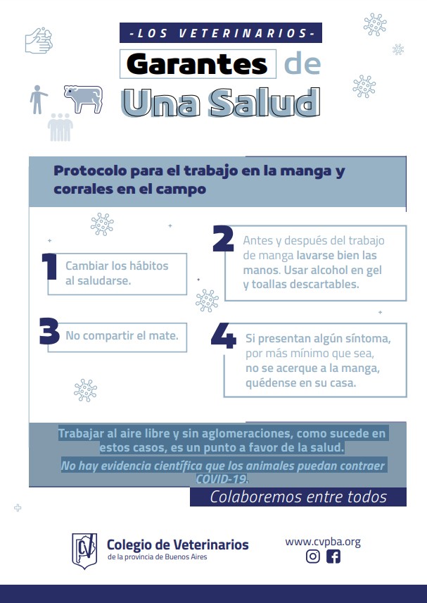 El protocolo está destinado a los profesionales que realicen su actividad en la manga o en los corrales en el campo. Por otra parte desde el Colegio señalaron que no hay evidencia científica que los animales puedan contraer COVID-19.