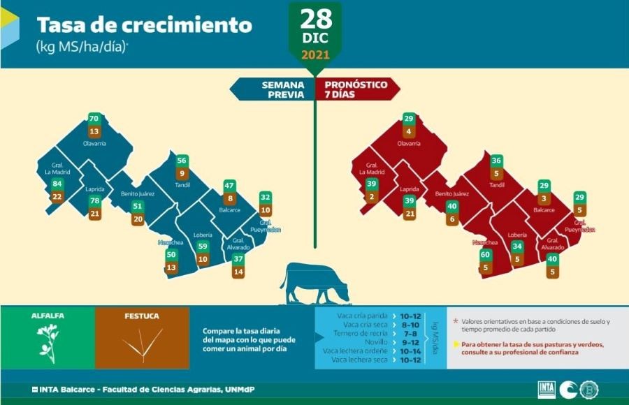 Nuevas infografías que reflejan la tasa de crecimiento estimada de festucas y alfalfas en 10 partidos bonaerenses, en base a modelos informáticos. Semana del 28 de diciembre.