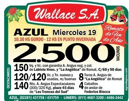 La firma de la vecina localidad de Azul anuncia su Remate Especial de Fin de Año en las instalaciones de la Sociedad Rural de Azul. Desde las 10,30 se subastara lo gordo y desde las 12 hs la invernada. Se anuncian 2500 vacunos Para más información contactarse al (02281) 431758 o en sus oficinas de Roca N° 452 (Azul) . Más detalles desde aquí