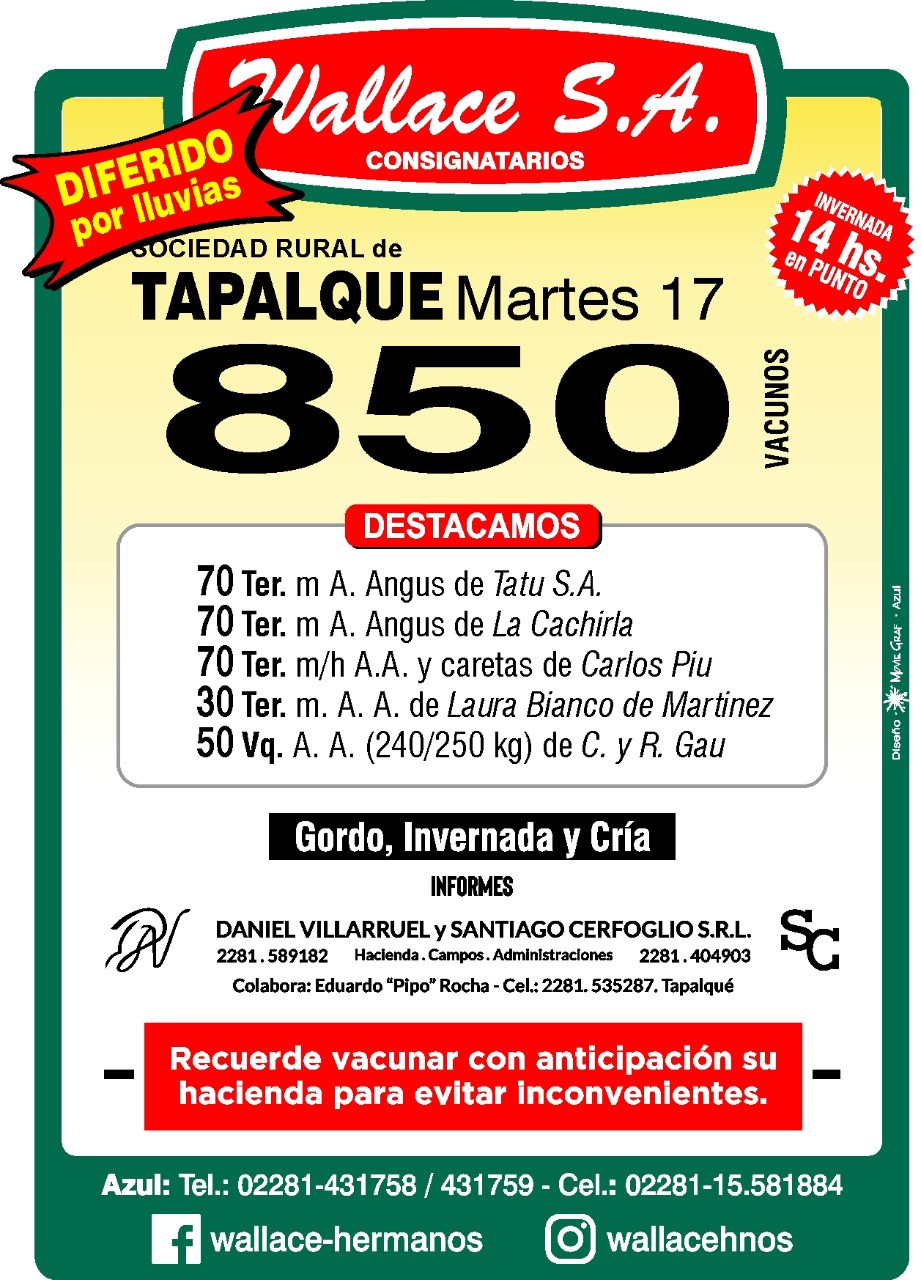 Wallace en Tapalqué diferido por lluvia para el martes 17