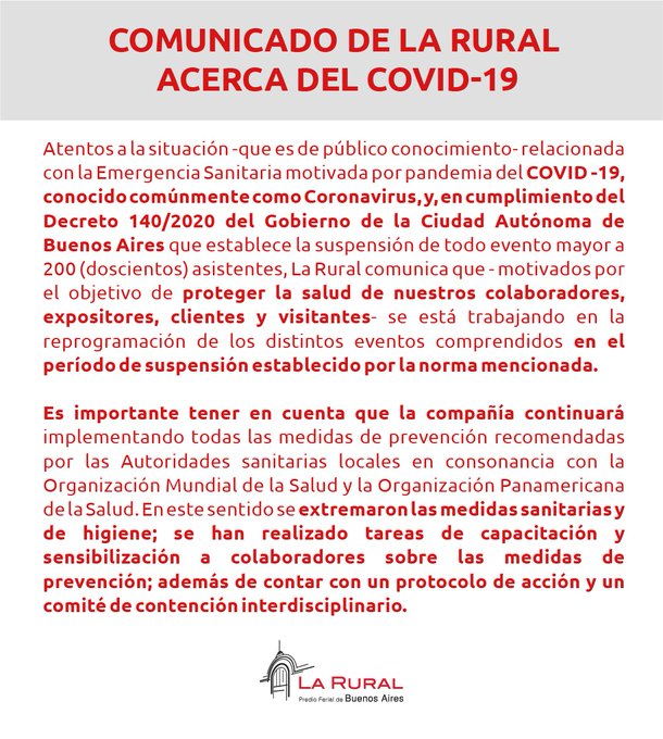 «Frente a la extensión del aislamiento social establecido, y como resultado del aplanamiento y consecuente corrimiento de la curva de contagios para el invierno, se tomó la decisión de postergar las fechas previstas inicialmente con el propósito de priorizar el cuidado de la salud de todos los involucrados», indicó la SRA en un comunicado.
