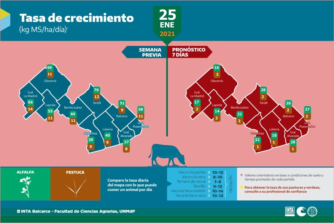Nueva infografía que refleja la tasa de crecimiento estimada de festucas y alfalfas en 10 partidos bonaerenses, en base a modelos informáticos. Semana del 25 de enero.