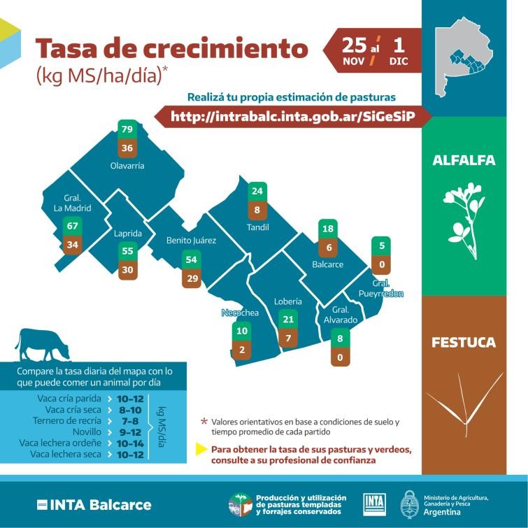 Nueva infografía elaborada por INTA Balcarce referida a la tasa de crecimiento promedio estimado de alfalfas y festucas para el período que va del 25 de noviembre al 1ro. de diciembre en 10 partidos bonaerenses, basándose en modelos informáticos.