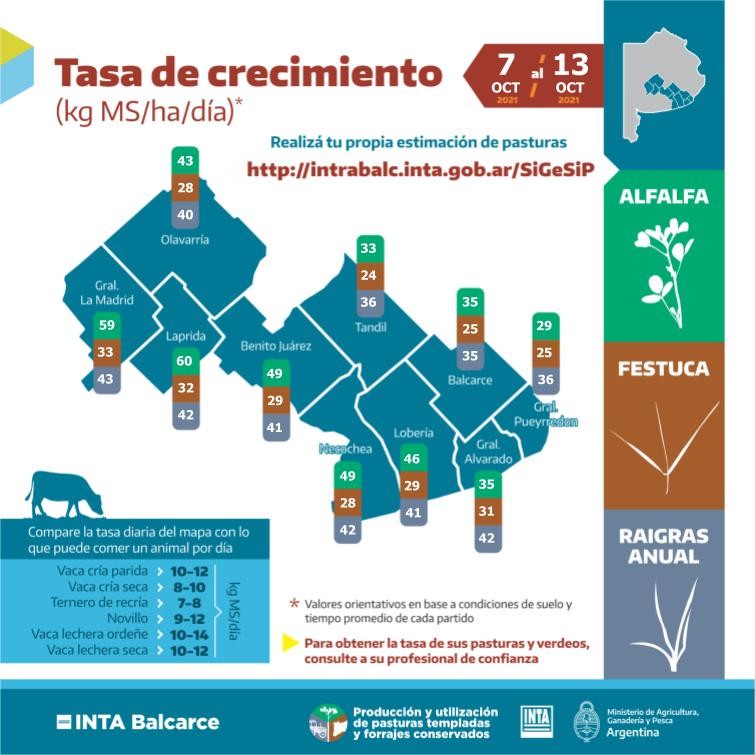 Nueva infografía elaborada por INTA Balcarce referida a la tasa de crecimiento promedio estimado de alfalfa, festuca y raigrás anual para el período que va del 7 al 13 de octubre en 10 partidos bonaerenses, basándose en modelos informáticos.