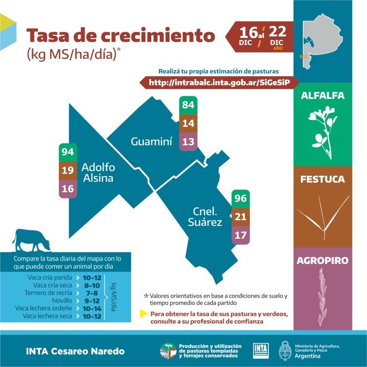 Crecimiento estimado de alfalfas, agropiros y festucas en 10 partidos bonaerenses del 16 al 22 de diciembre, en base a modelos informáticos. Ingresá y calculá el tuyo a nivel de lote.